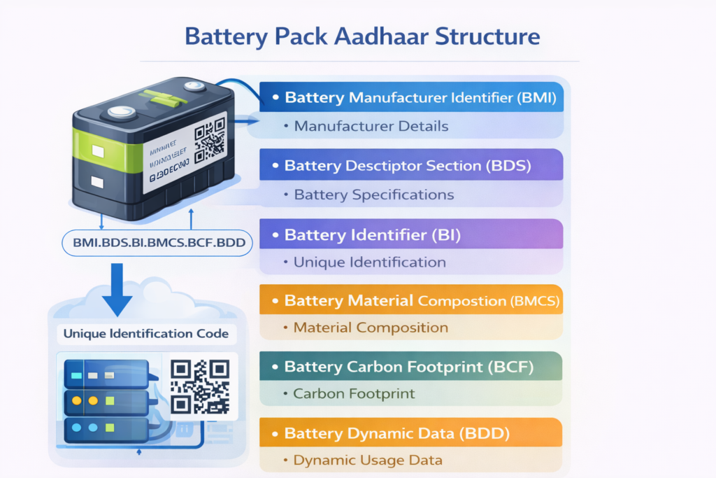 The Battery Pack Aadhaar System is a digital identification framework for batteries. Each battery pack receives a unique alphanumeric identification code and QR-based identity, which links to a centralized database containing detailed information about the battery.